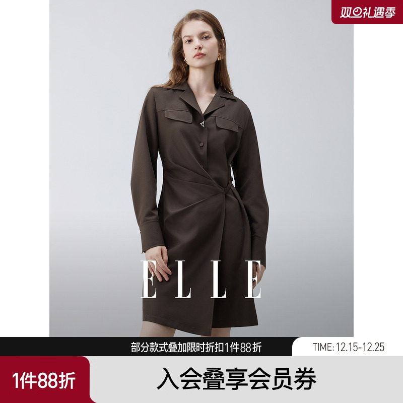 ELLE法式设计感翻领衬衫连衣裙女2025秋季新款长袖休闲通勤短裙子