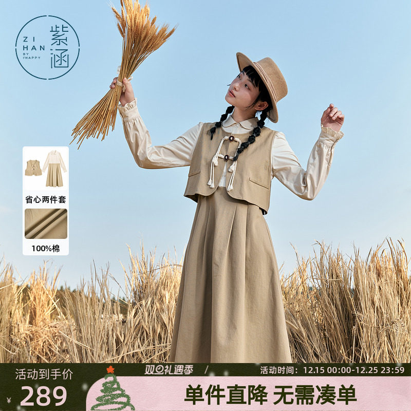 紫涵无袖背心马甲拼接长袖衬衫连衣裙两件时尚休闲套装女秋季新款