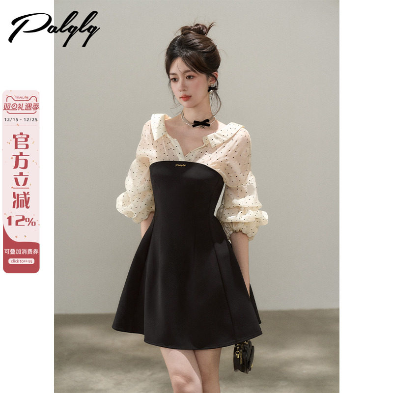 菲梦伊亮片黑色蝴蝶结衬衫连衣裙女长袖秋装法式高端名媛A字裙子
