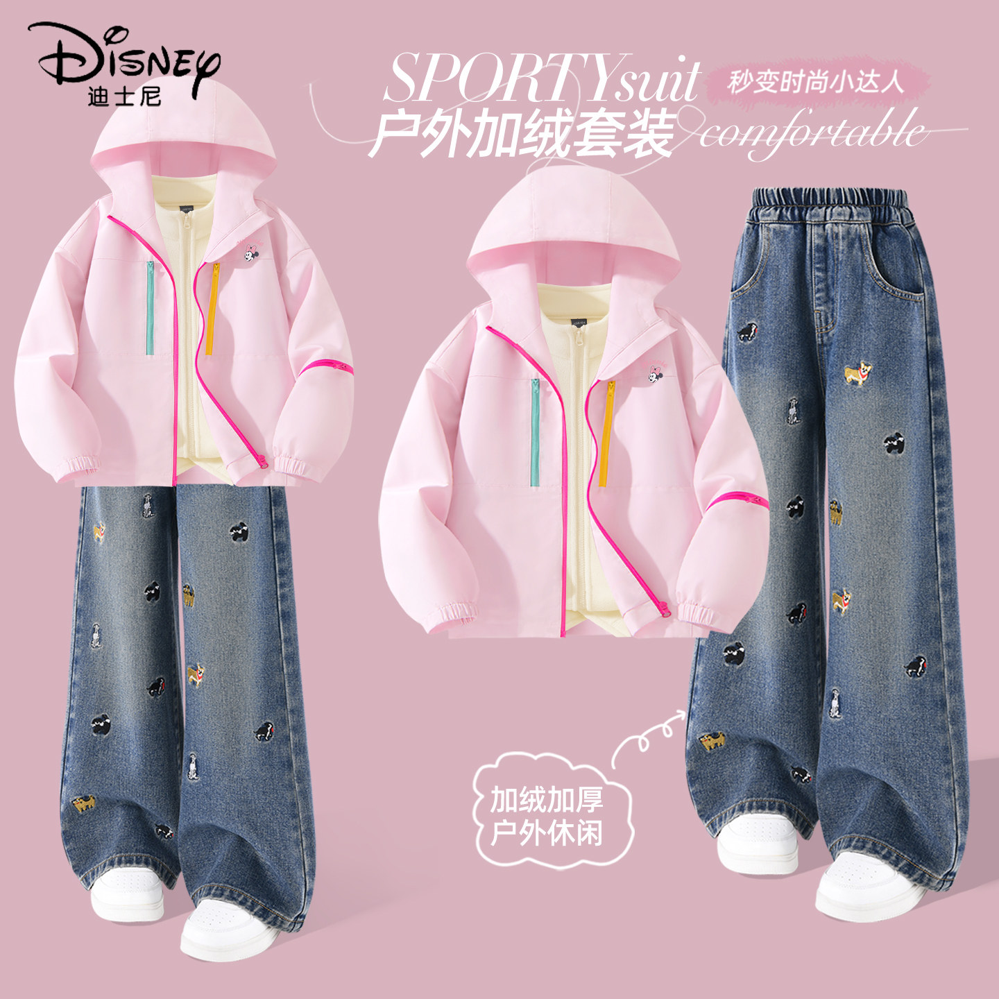 迪士尼女童加绒套装2026新款中大童时尚潮流秋冬款软壳衣儿童冬装