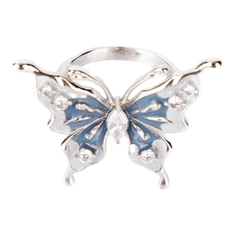 蓝色微镶锆石蝴蝶戒指女 开口可调节立体指环 新潮森系超仙饰品女