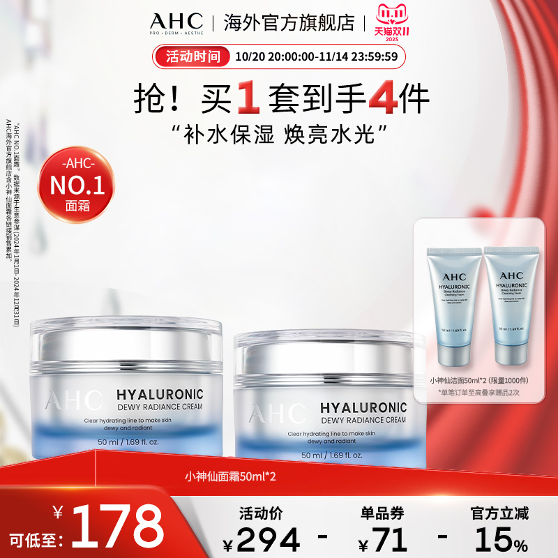 【双11抢购】AHC玻尿酸小神仙面霜2盒装补水保湿女官方旗舰店正品