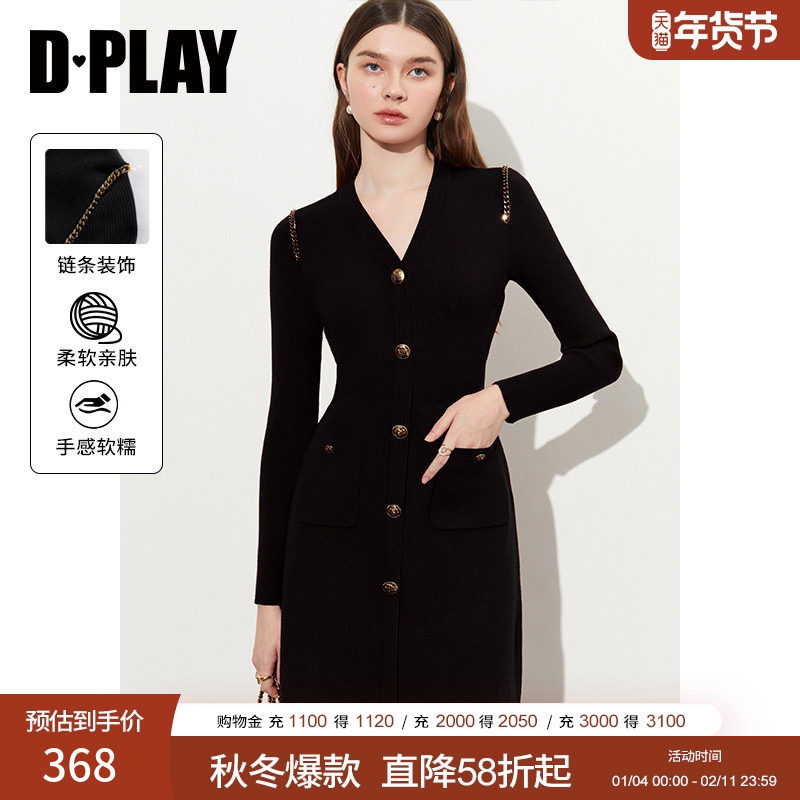 阔色黑色v领内搭打底针织连衣裙女25秋冬季新款长袖毛衣小黑裙子