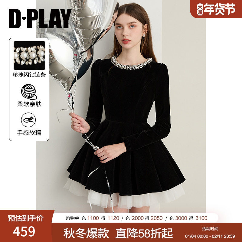 pusumede黑色丝绒连衣裙女新款设计感气质复古长袖小黑裙收腰短裙