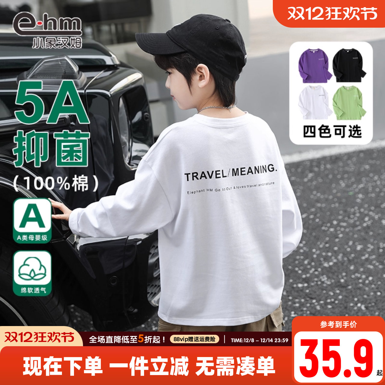 小象汉姆童装男童长袖T恤纯棉儿童打底衫2025秋装新中大童白色A类