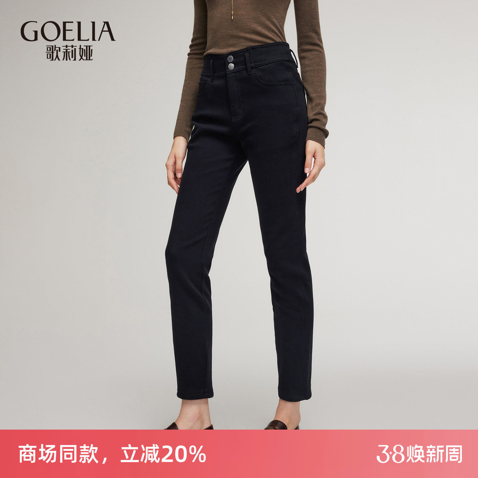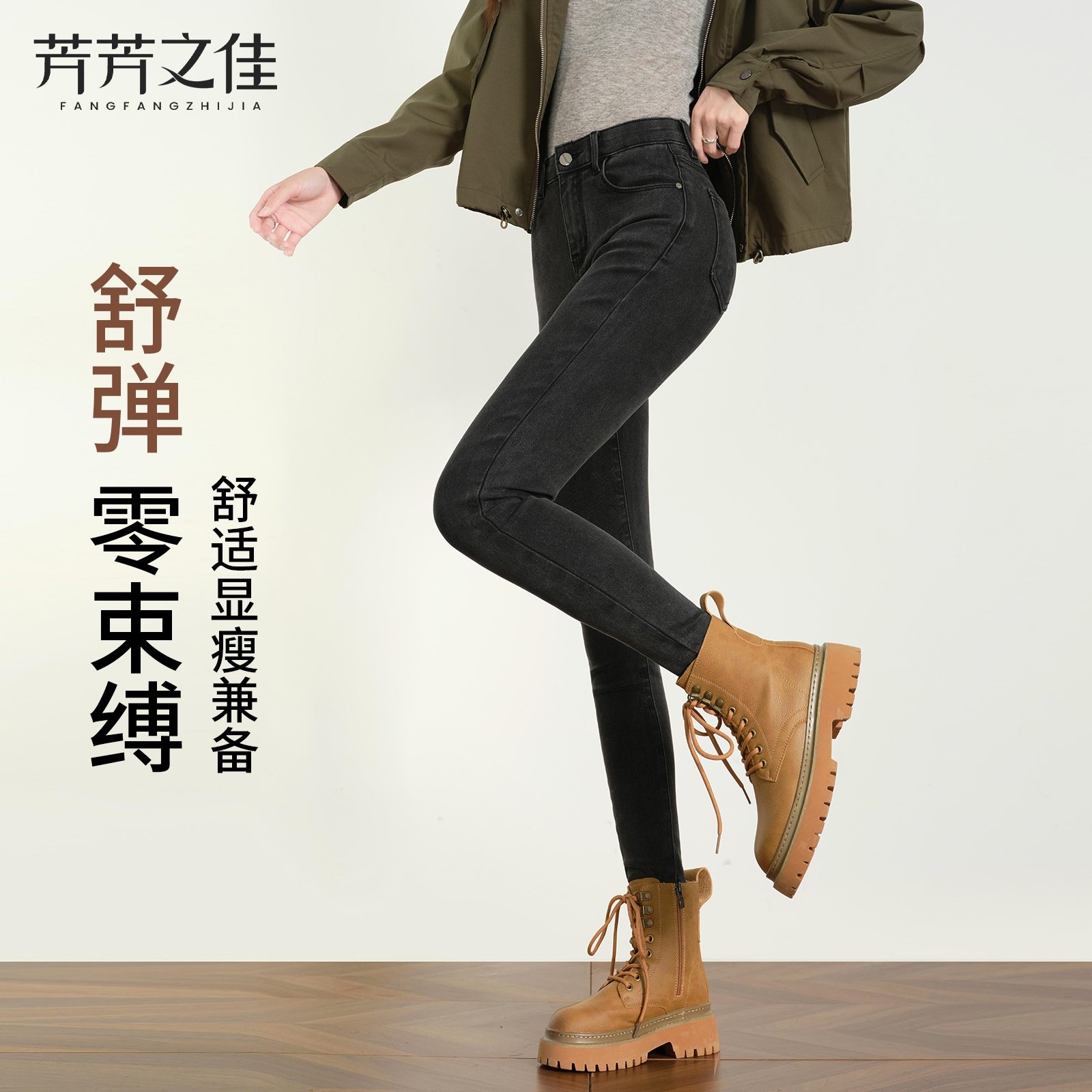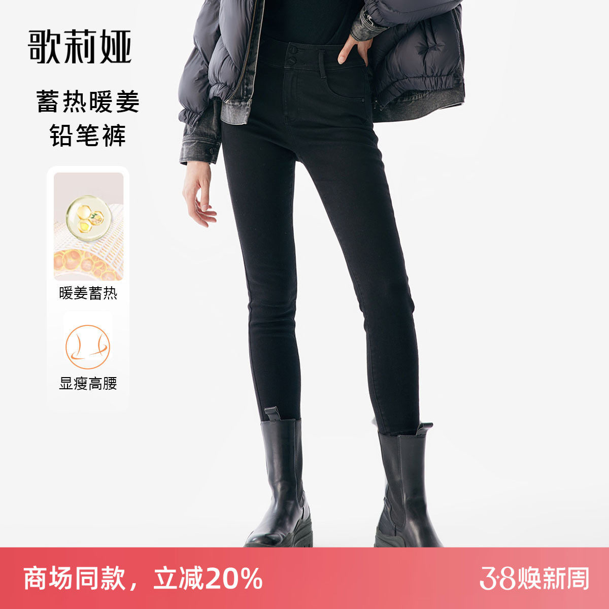 歌莉娅黑色牛仔裤女秋冬穿搭靴裤暖姜高腰显瘦紧身小脚裤保暖长裤