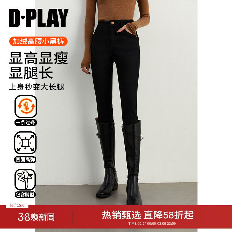 DPLAY黑色小脚裤高腰金属扣弹力加绒牛仔裤水洗长裤女显瘦靴裤