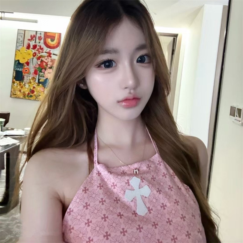 十字架数码印花皮标吊带背心女夏季新款纯欲辣妹露背显瘦绑带肚兜