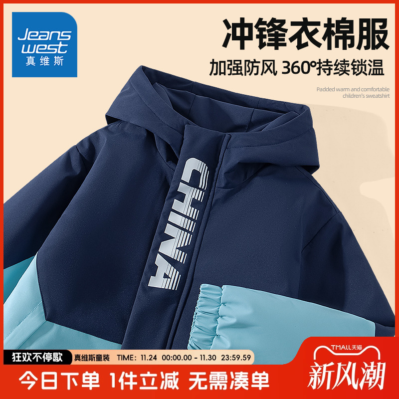 真维斯男童外套秋冬款2025新款男大童夹棉冲锋衣加绒冬季儿童棉服