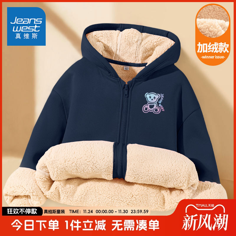真维斯童装男童外套秋冬款儿童羊羔绒连帽卫衣开衫男孩加绒上衣秋