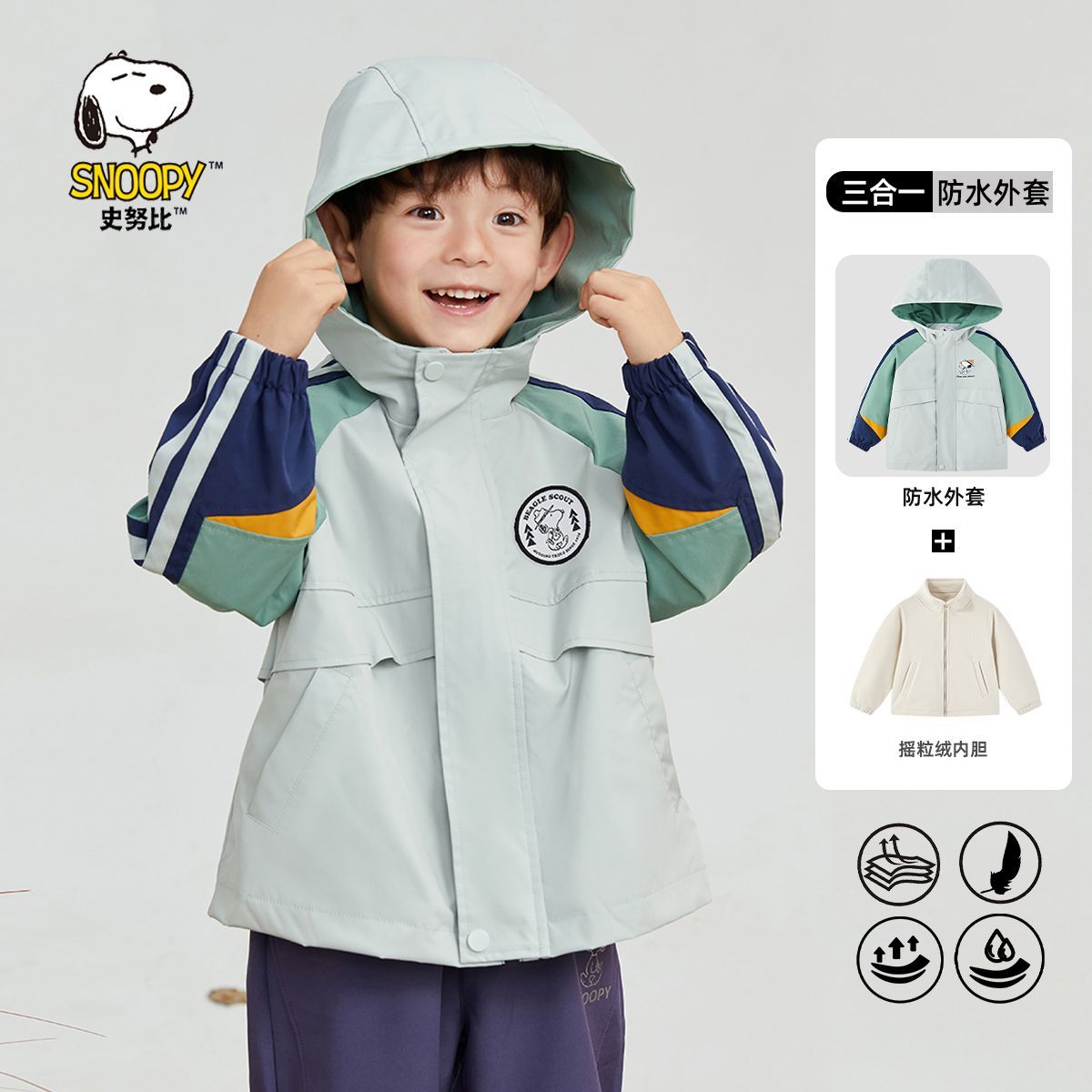 史努比男童外套秋冬款2025新款男孩三合一冲锋衣夹克儿童加绒上衣
