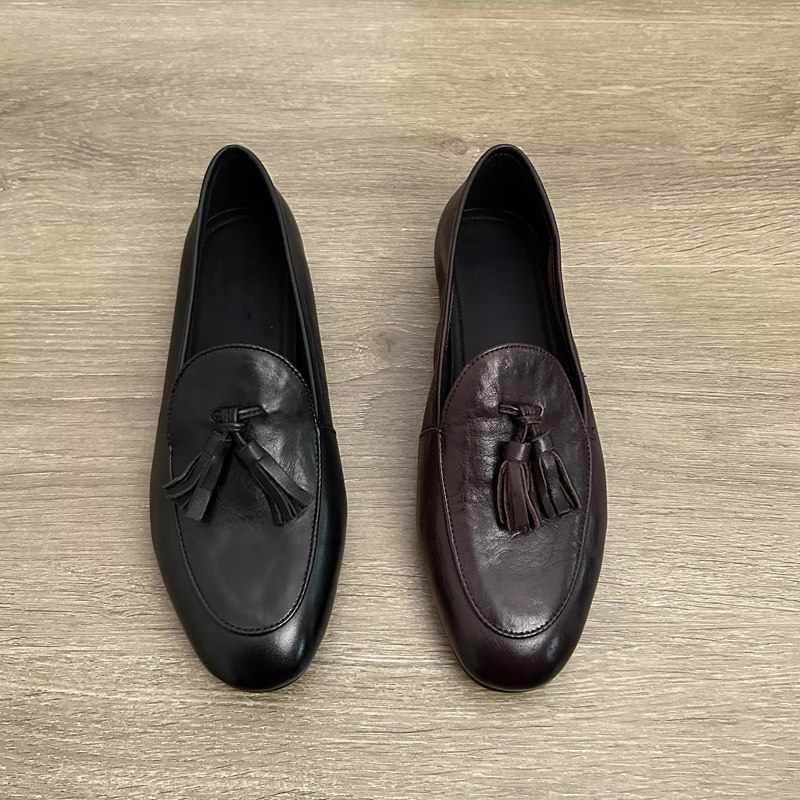 欧洲站2025春季新款真皮复古平底流苏一脚蹬乐福鞋女英伦风小皮鞋