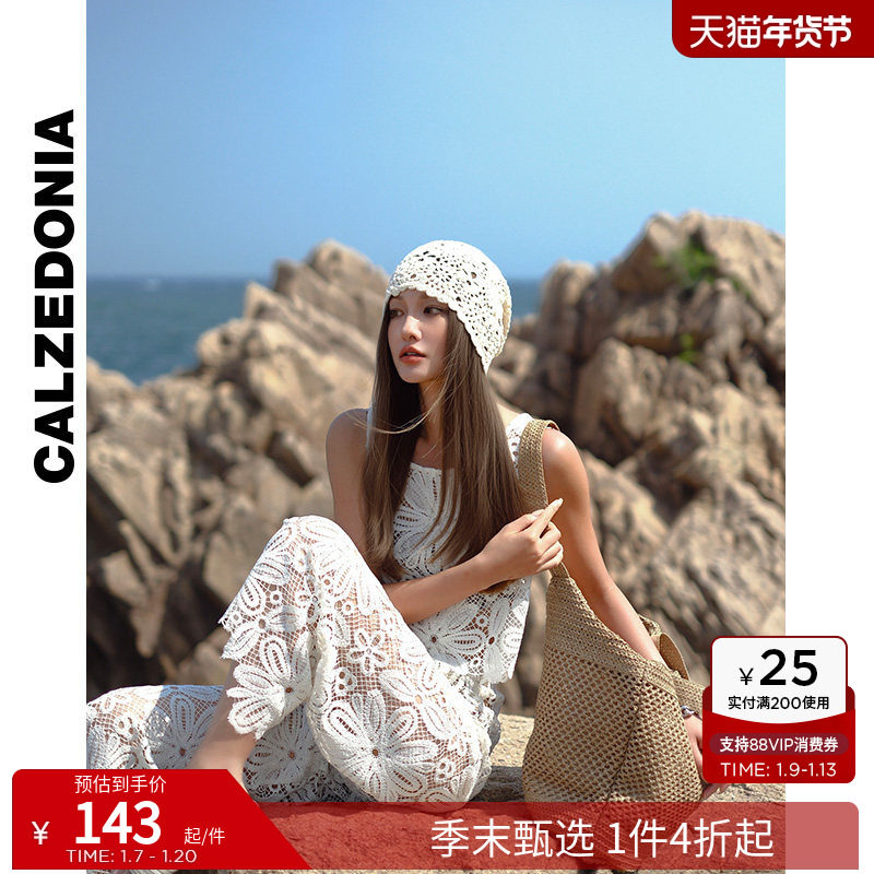 - 蕾丝镂空高腰连衣裙
