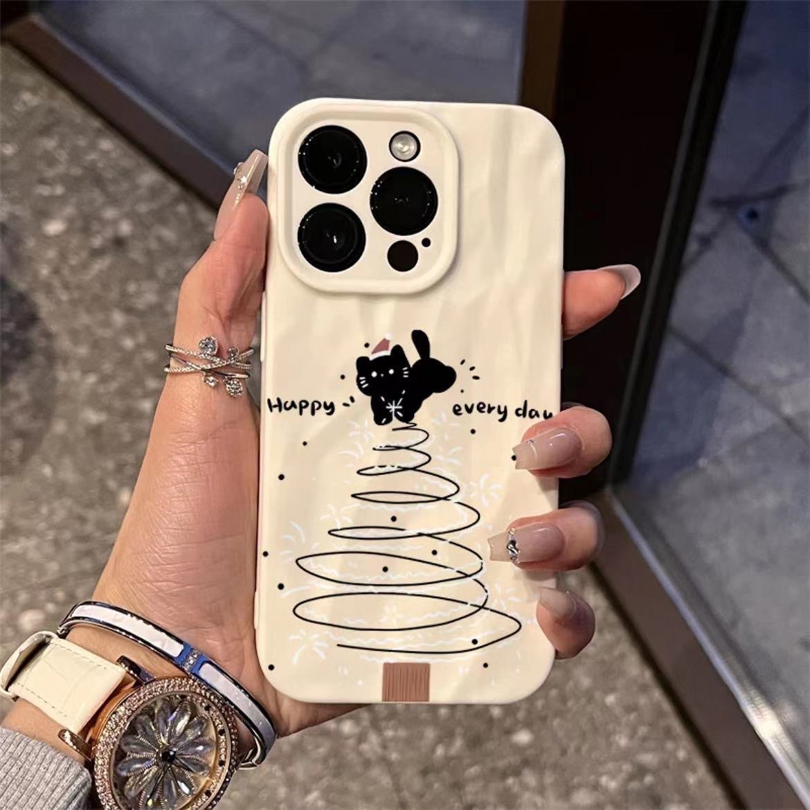 黑色线条小猫圣诞树冬日适用于苹果15promax软14p搞怪手机壳磨砂褶皱个性 11/12promax高级xs/xr防摔7p