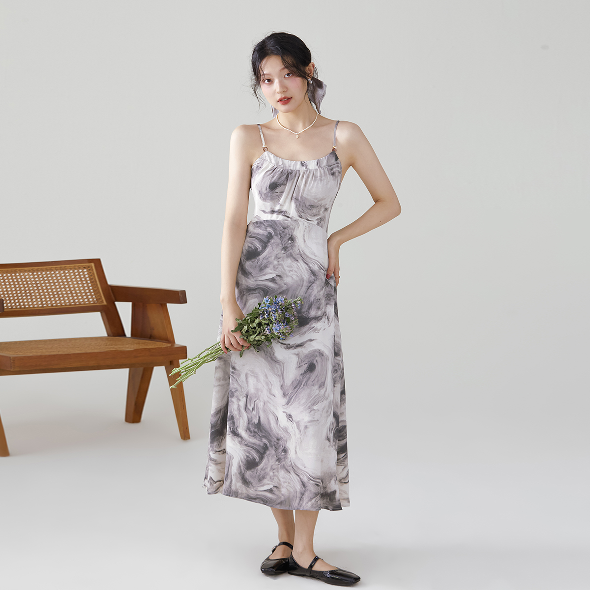 one more水墨印花吊带连衣裙女2025夏季新款高级感度假沙滩裙长裙