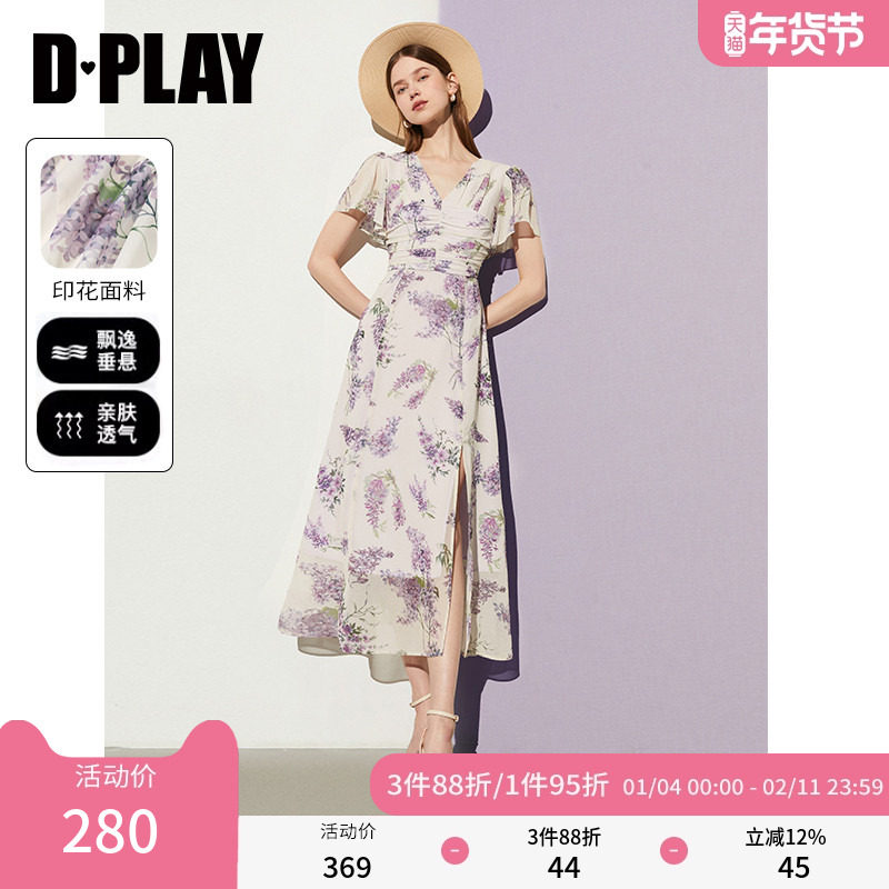 DPLAY夏季法式短袖紫色连衣裙女印花裙子海边度假沙滩裙长裙