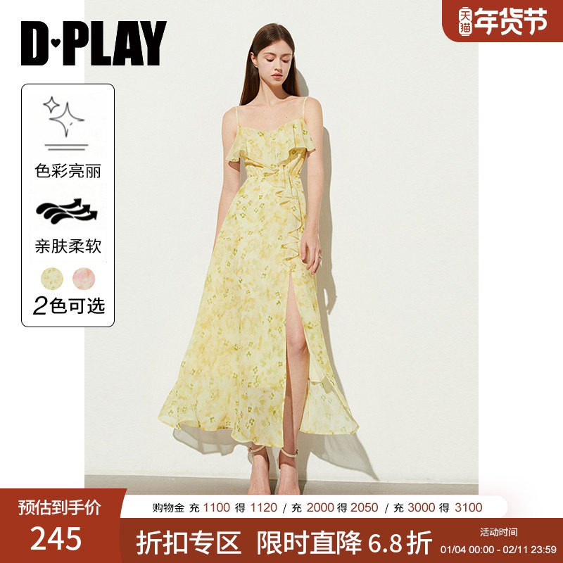 DPLAY2025年夏季度假缎面白色印花吊带裙连衣裙女沙滩裙长裙裙子