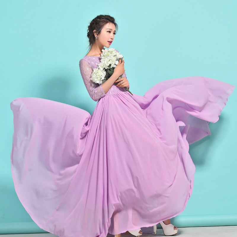 2025夏季新款长袖气质雪纺显瘦长款大摆连衣裙脚踝沙滩裙长裙飘逸