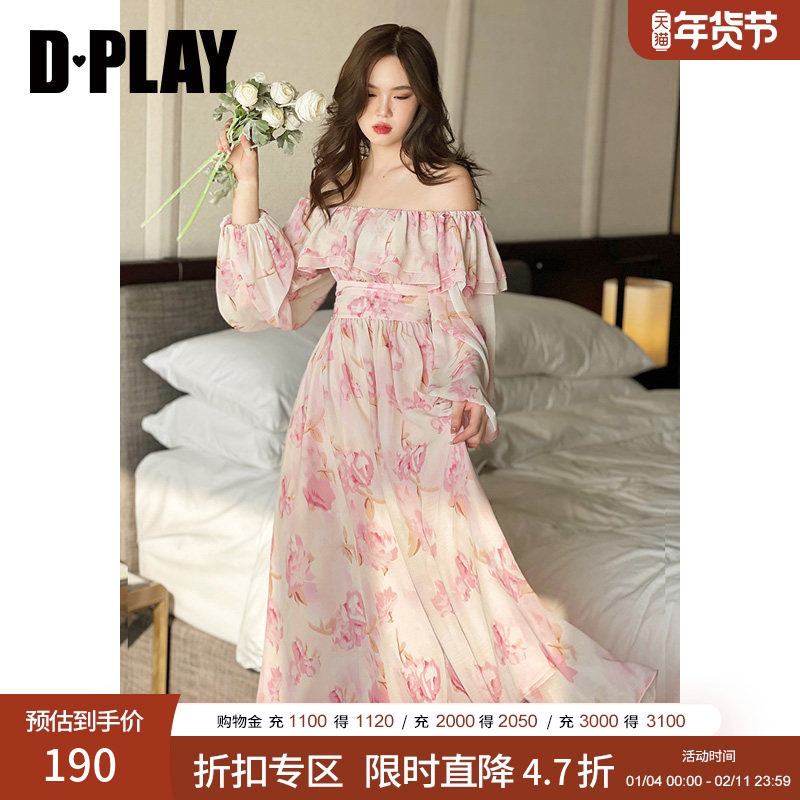 DPLAY德帕拉一字肩荷叶边粉色连衣裙女度假海边沙滩裙长裙裙子