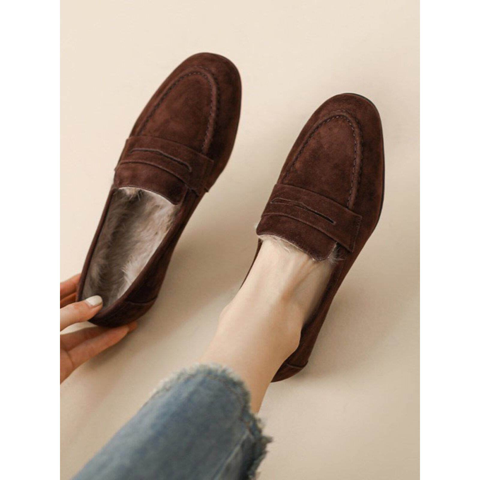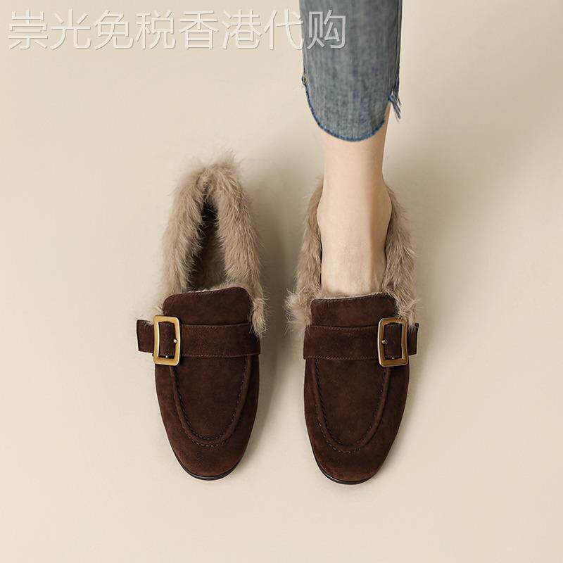香港磨砂羊皮兔毛加绒乐福鞋女2025秋冬新款圆头毛毛棉鞋平底单鞋
