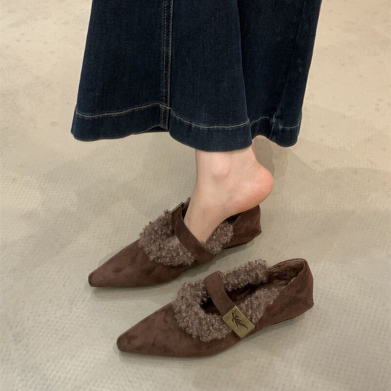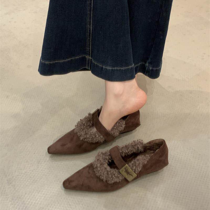柔光雪兔~温柔兔毛翻领尖头拖复古单鞋秋冬INS加绒毛毛鞋ol仙女风