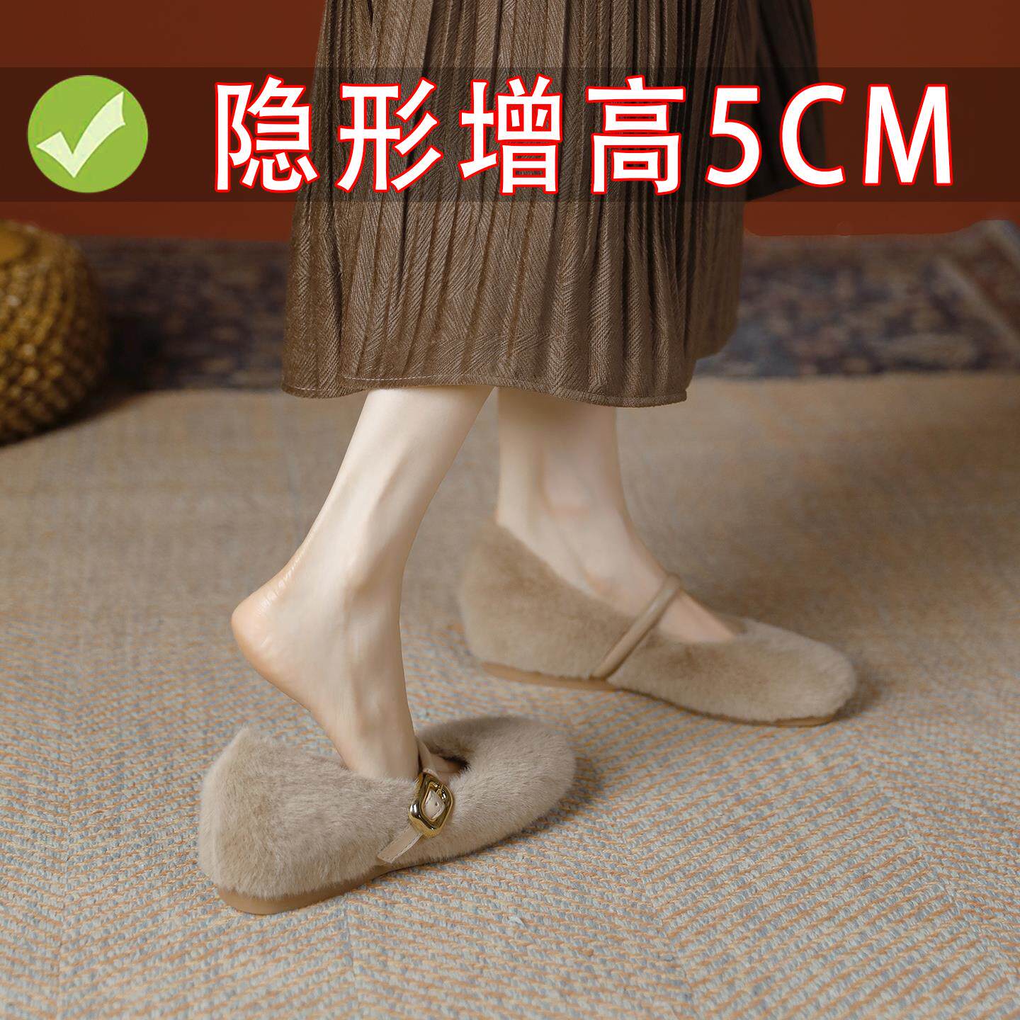香港兔毛内增高鞋子2025年冬季豹纹玛丽珍毛毛鞋女外穿加绒单鞋女