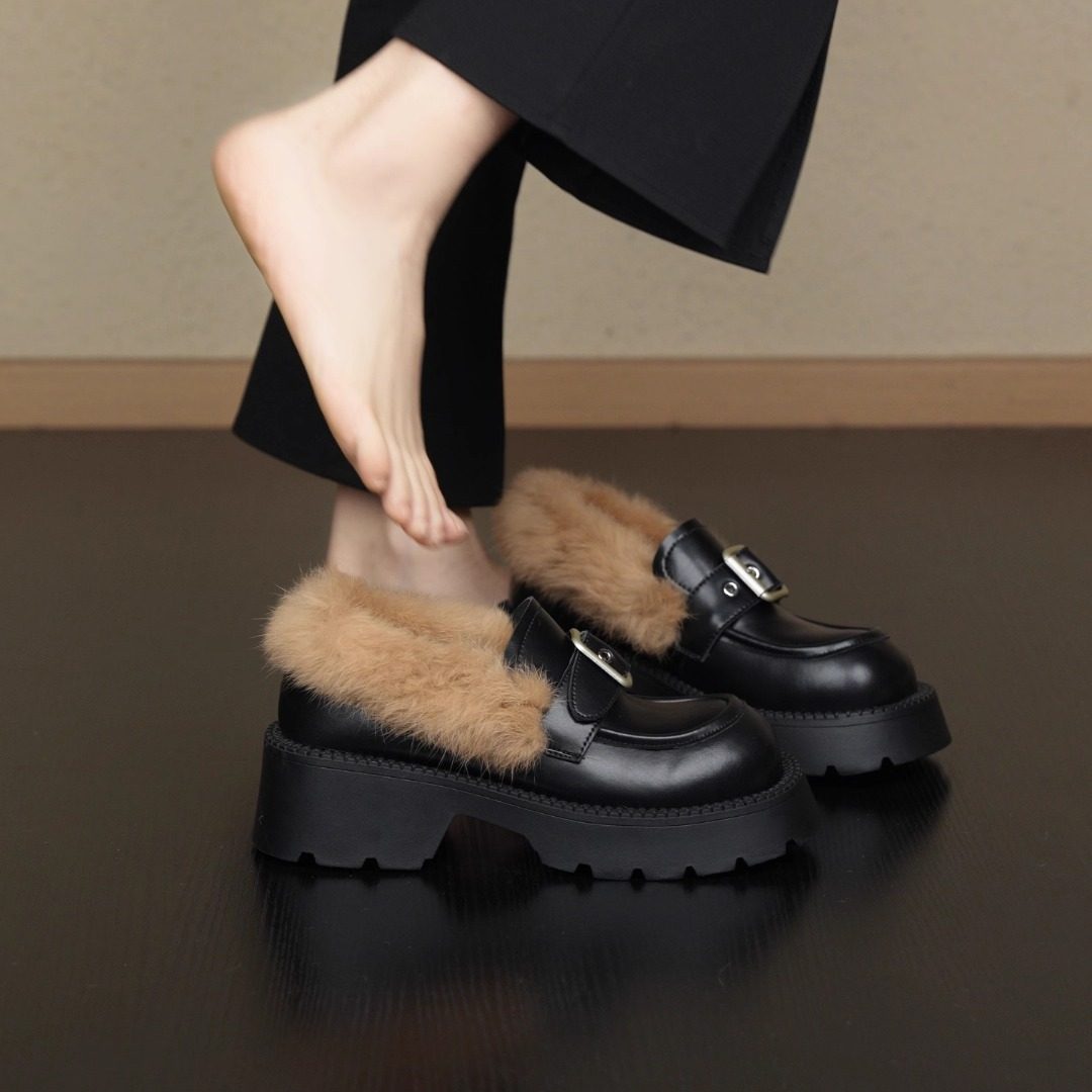 nnmiss/3cm复古通勤羊皮山茶花乐福鞋秋冬百搭舒适保暖兔毛单鞋
