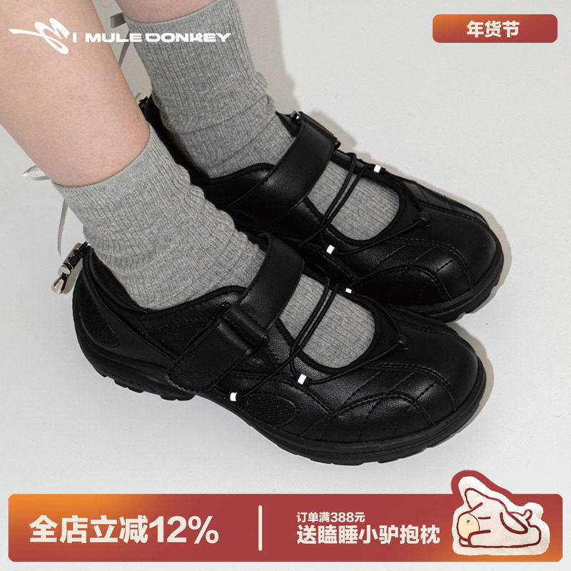 多嘴驴Donkey黑色玛丽珍鞋女款秋季魔术贴软底镂空运动透气小皮鞋