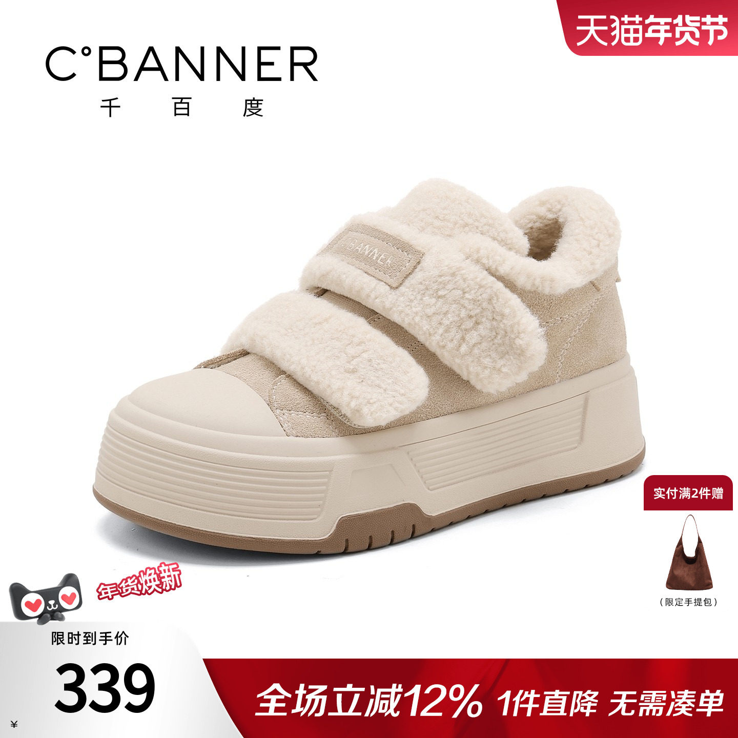 千百度厚底加绒棉鞋女冬季2025新款运动休闲鞋保暖魔术贴毛毛鞋女