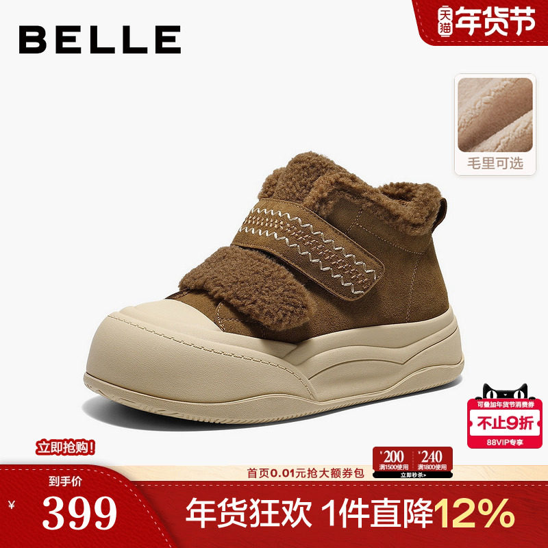 百丽高帮魔术贴毛毛板鞋女新款加绒休闲运动棉鞋雪地靴B3017DM5