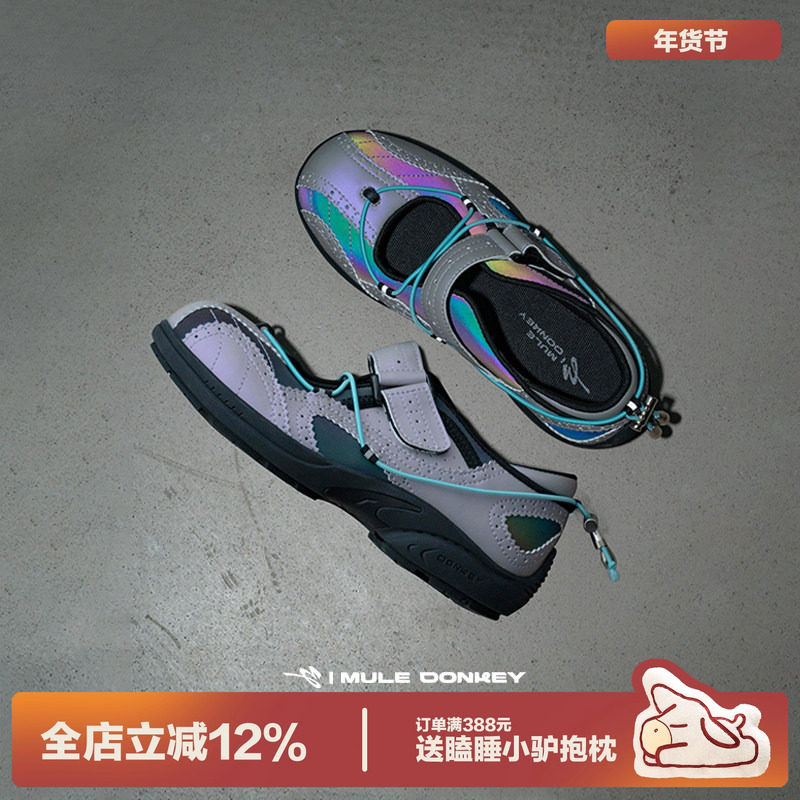 多嘴驴Donkey镭射玛丽珍女鞋秋季镂空运动紫色魔术贴机能浅口单鞋