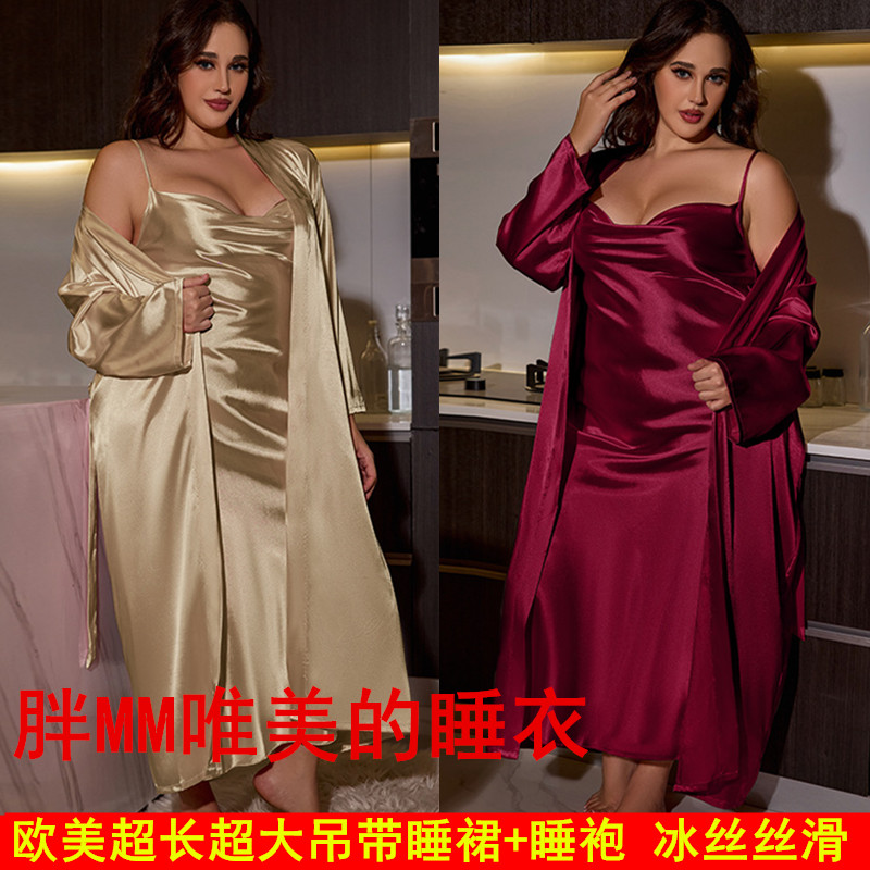 性感加肥加大码冰丝仿真丝高级感带胸垫吊带睡裙两件套胖mm200斤