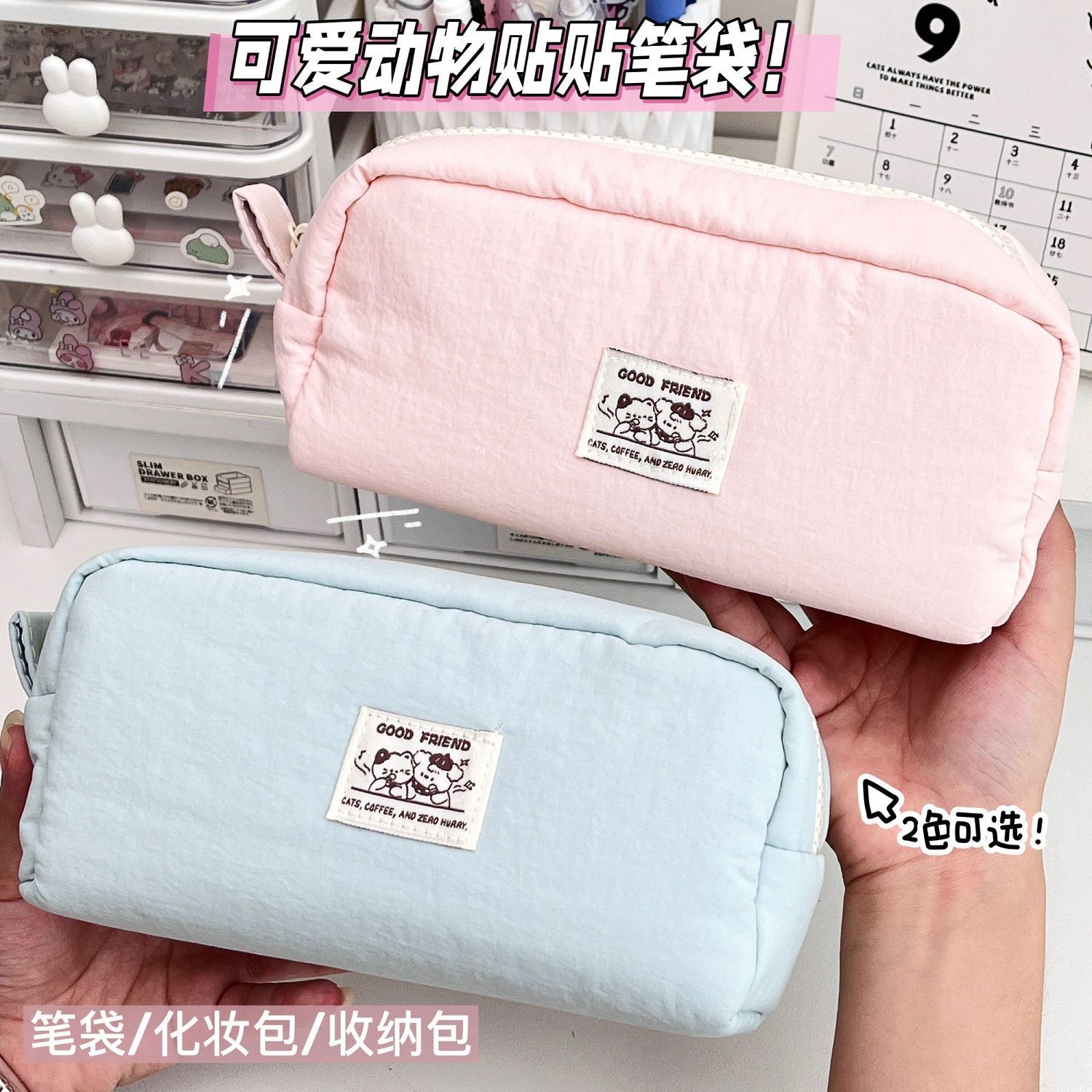 可爱动物贴纸笔袋化妆包收纳包便携大容量学生文具盒ins风设计款小众极简纯色韩版初中女生文具铅笔袋高颜值