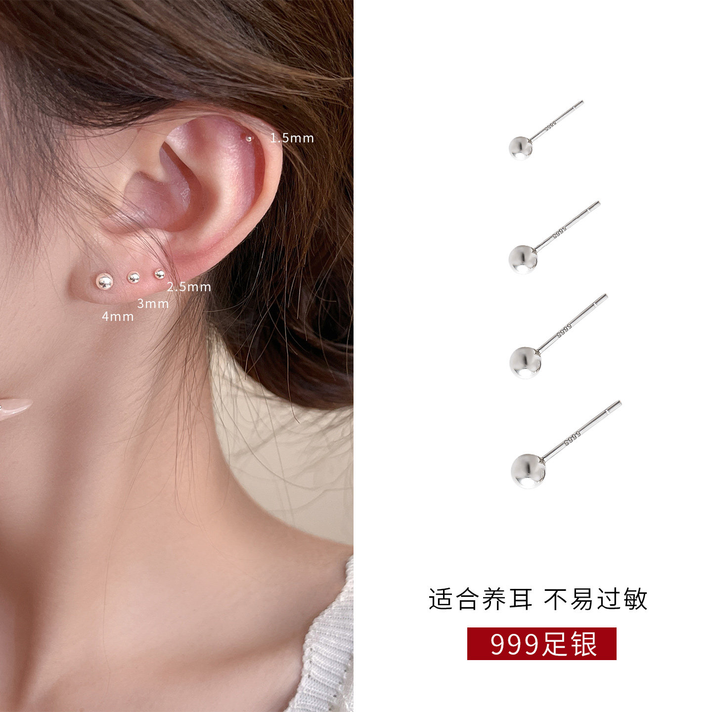 Z小姐999纯银圆珠耳钉养耳洞睡觉免摘2025新款爆款防堵耳棒耳饰女