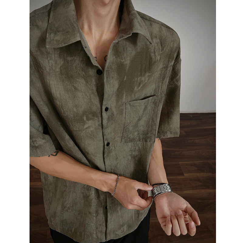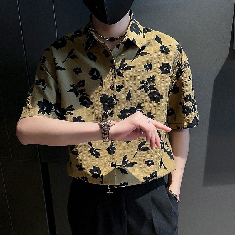 潮牌新款上衣衬衣衬衫宽松夏季男生痞帅短袖翻领棕色花色半截袖男
