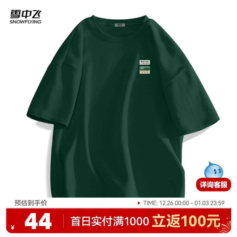 雪中飞纯棉t恤男短袖夏季新款宽松半截袖男士潮流复古绿色体恤PC