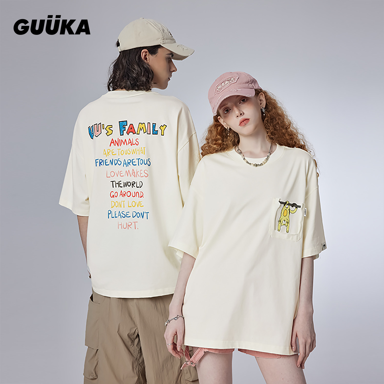 GUUKA古由卡奶白色T恤重磅短袖情侣猫咪绒感发泡印花宽松半截袖男