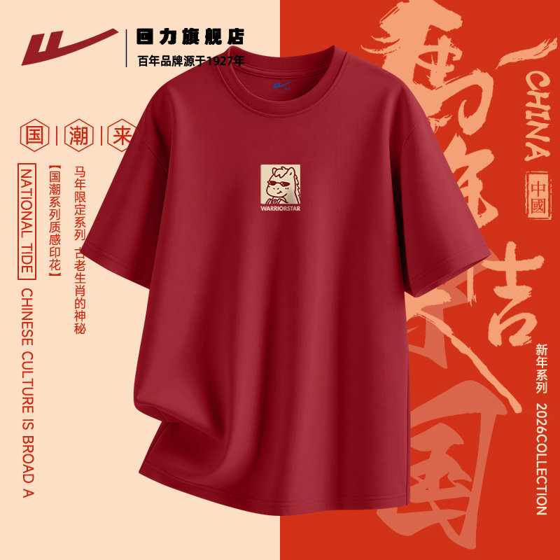 回力本命年短袖男纯棉2026新款宽松大码半截袖男士新年红色衣服K