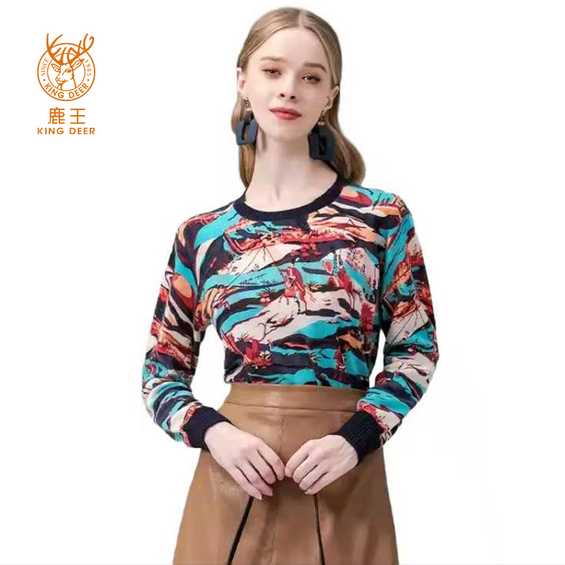 鹿王羊绒衫女圆领平针印花套头长袖打底时尚薄款秋冬新款修身毛衣