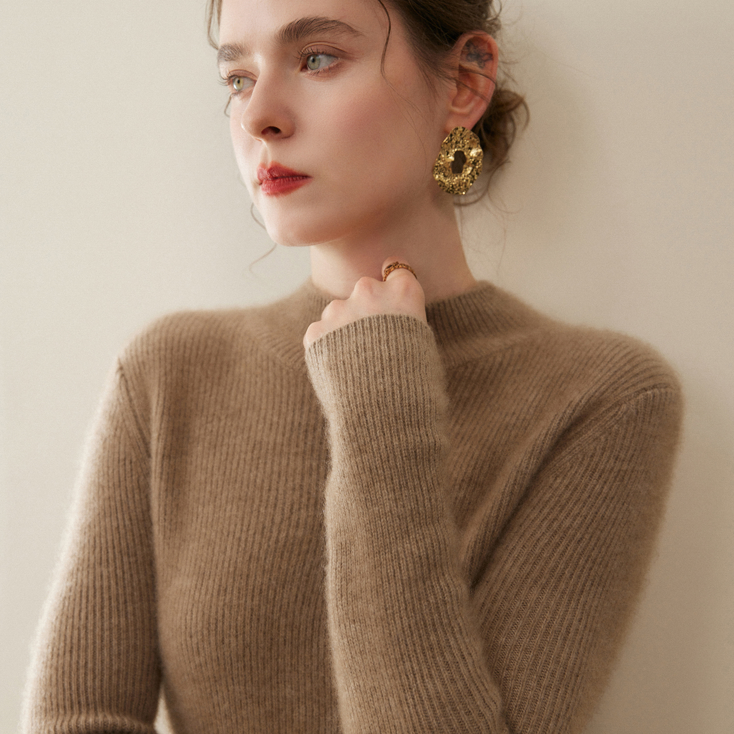 25秋冬新款100%山羊绒衫女半高圆领竖条纹内搭套头修身针织打底衫