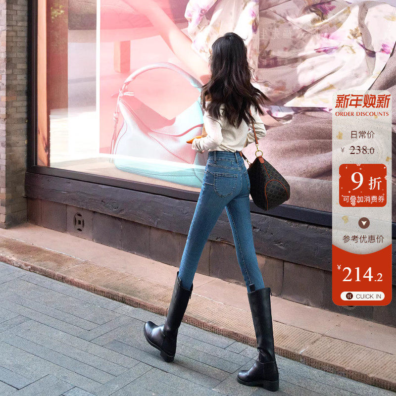 曼德诗牛仔裤女高腰小脚裤2025冬季新款弹力九分铅笔裤休闲裤子