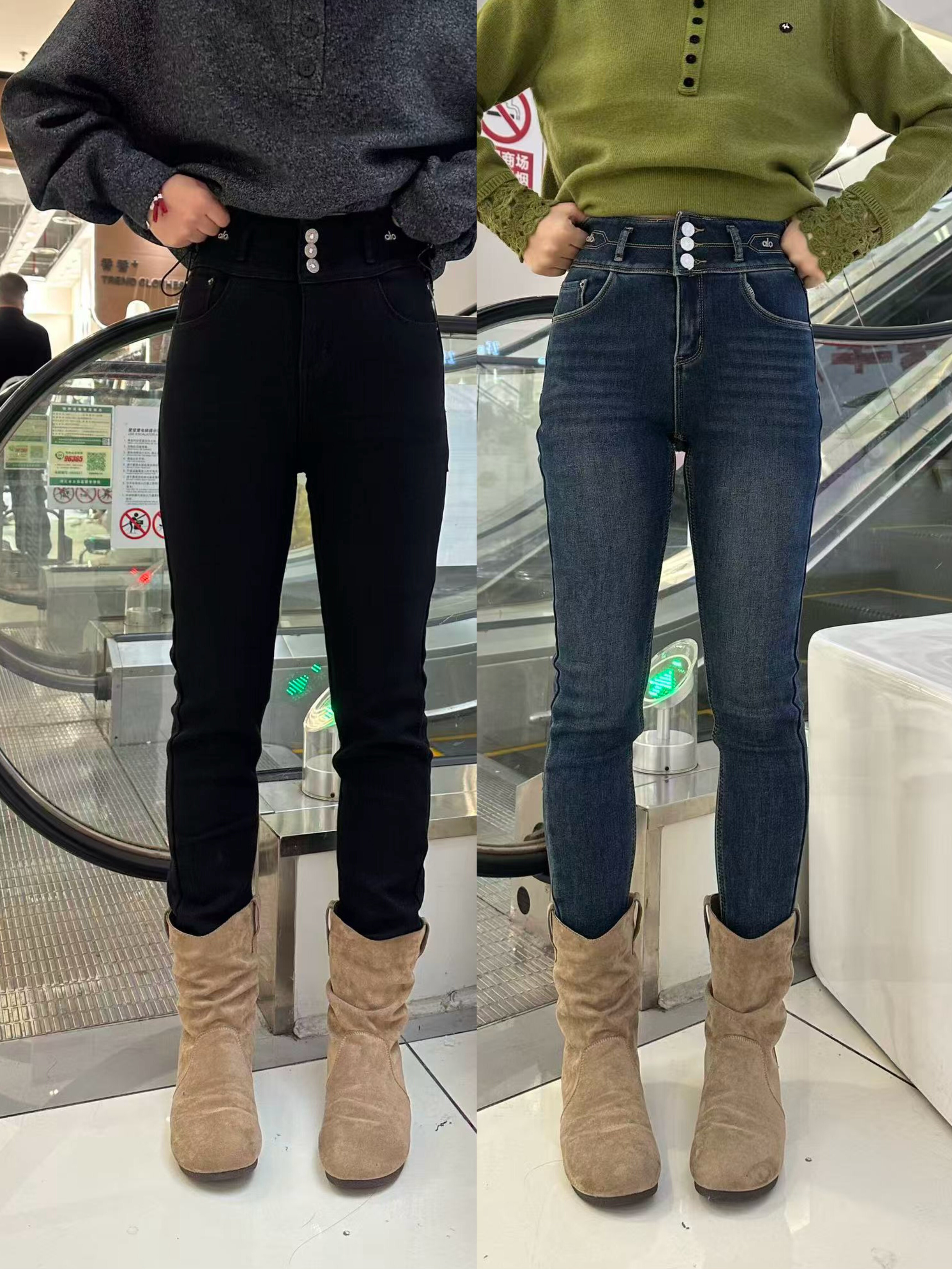 加绒小脚牛仔裤女薄绒冬季2025新款高腰显瘦紧身弹力植绒铅笔长裤