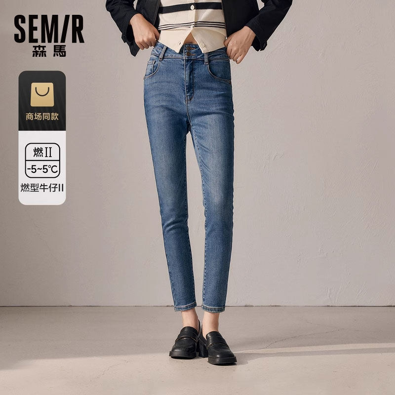 [商场同款]森马牛仔裤女高腰小脚裤小个子2025冬新款修身抓绒长裤