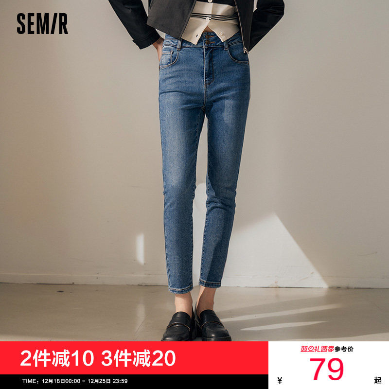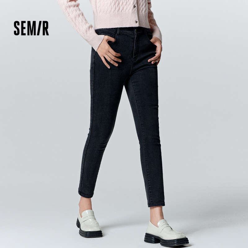 [商场同款]森马牛仔裤女高腰小脚裤小个子2023冬修身抓绒长裤