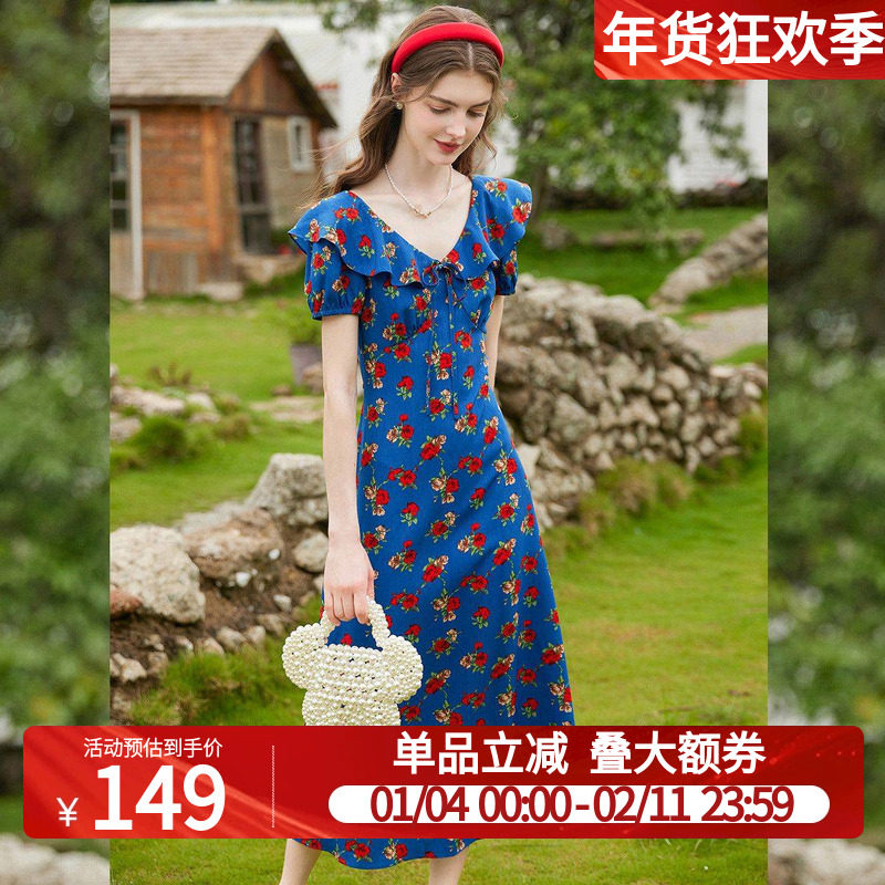 白鹿语温柔甜美碎花裙25夏新款V领无弹荷叶边长款女式花卉连衣裙
