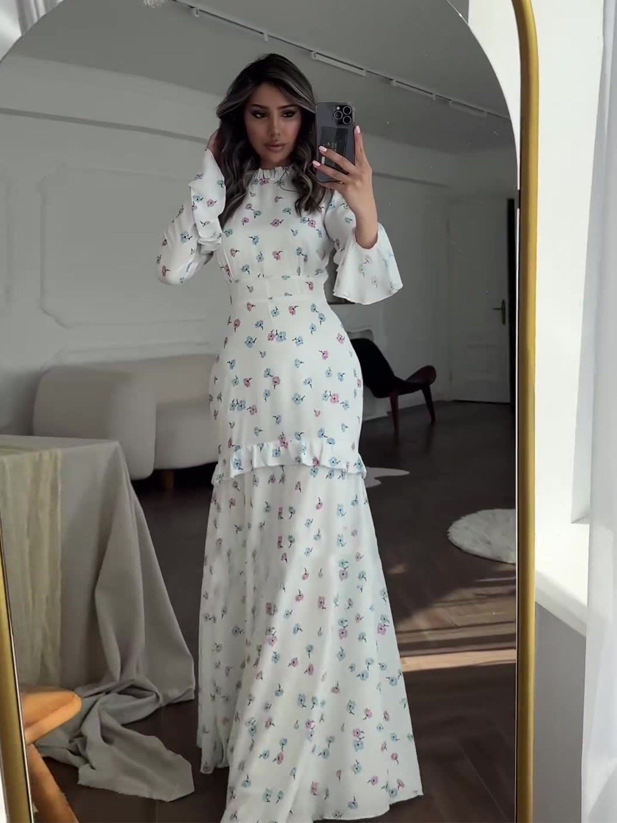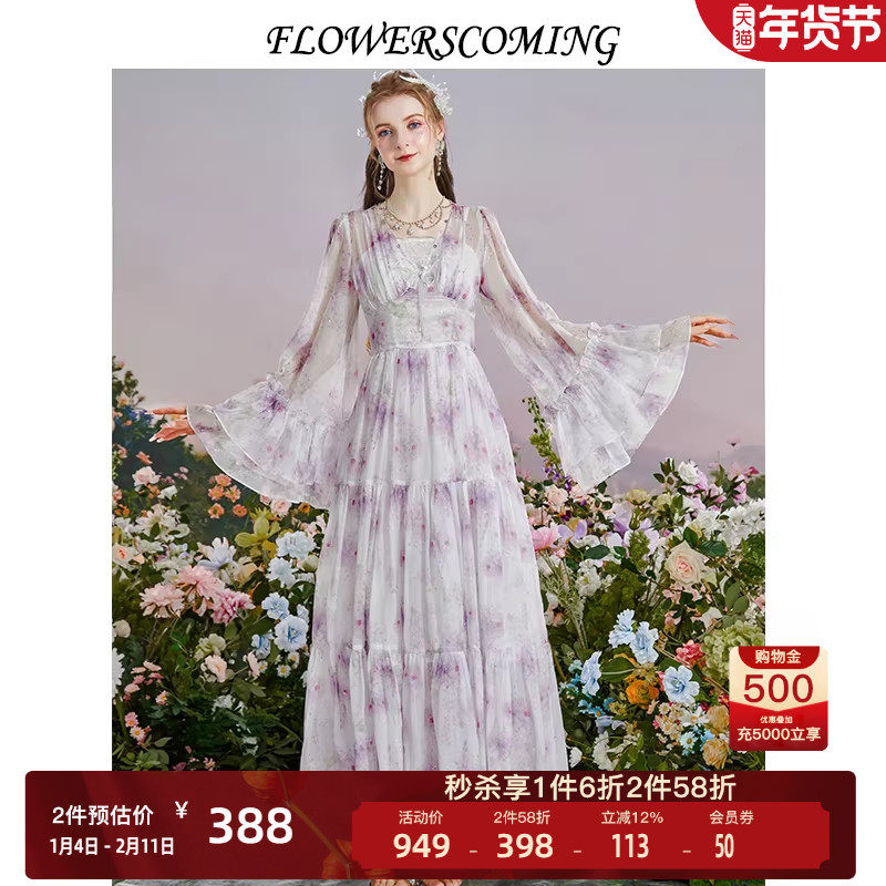 花儿开了2025年秋季新款法式印花长款连衣裙女设计感荷叶边蛋糕裙