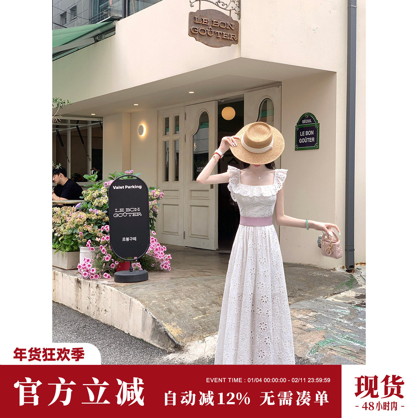 Sun雅乔【一诺倾情】夏季韩版甜美方领荷叶边绣花全棉长款连衣裙