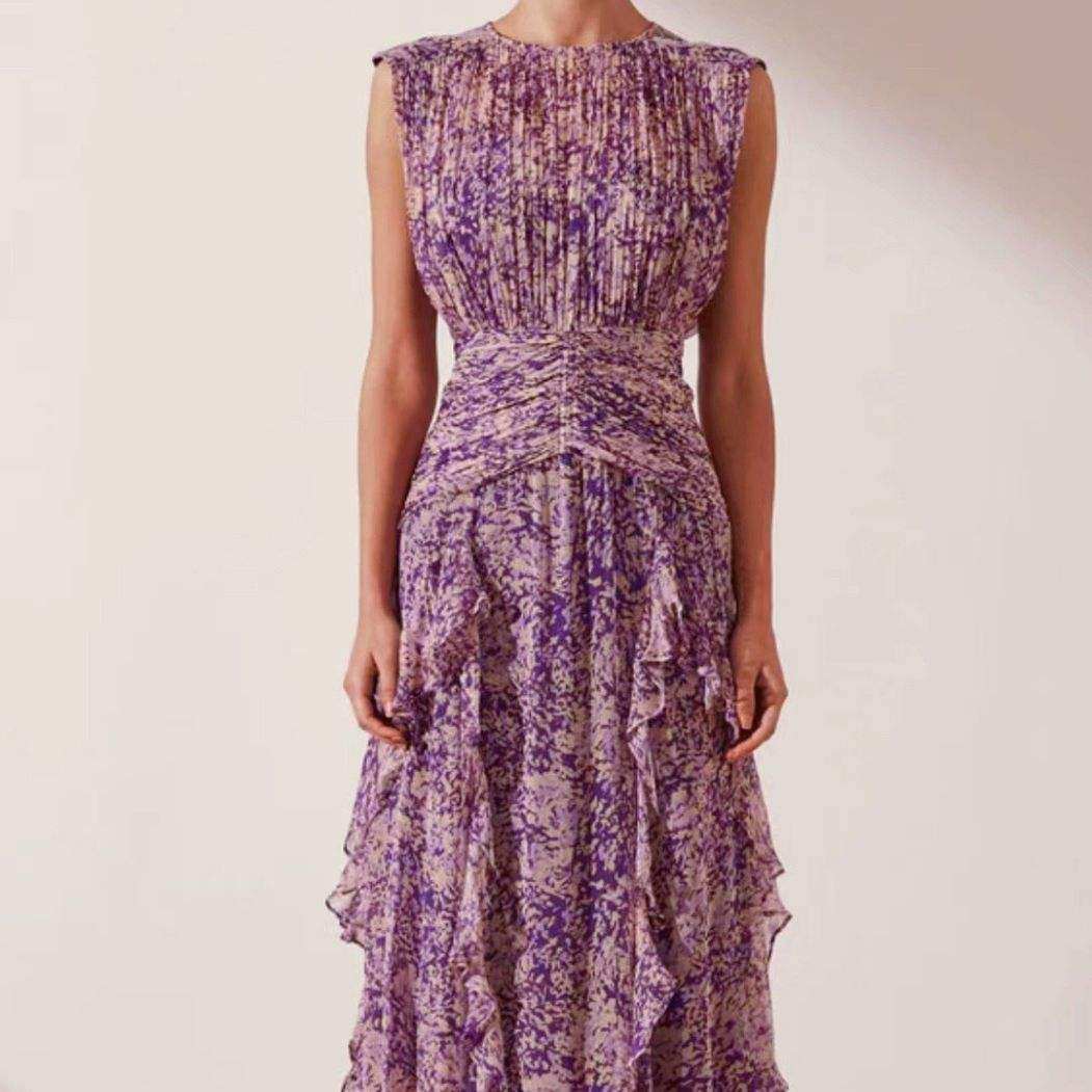 Xinlei Lin“落日人鱼湾”碎花雪纺法式多层荷叶边长款连衣裙女