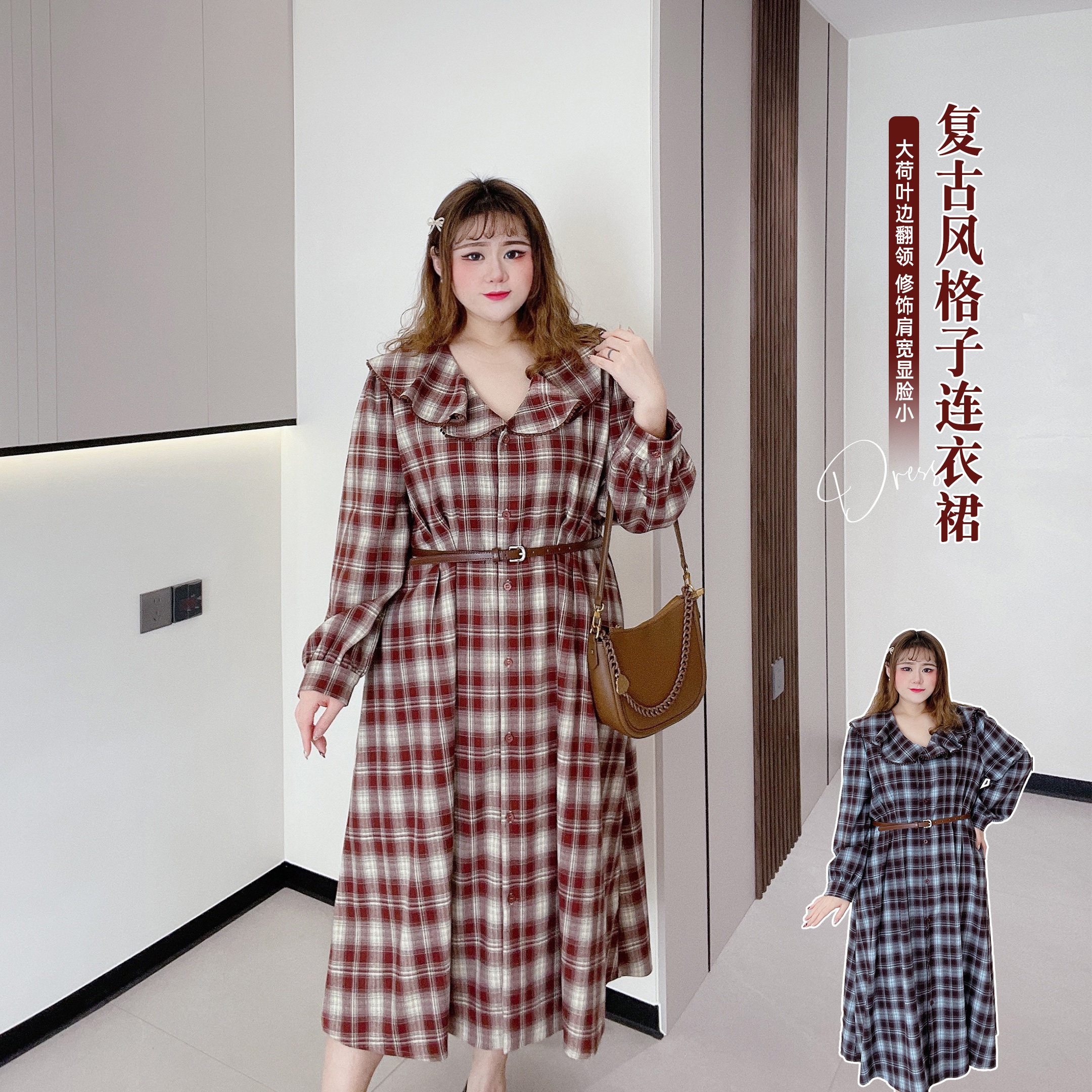 2025秋冬胖莹莹大码女装高级感格纹复古收腰气质荷叶边长款连衣裙