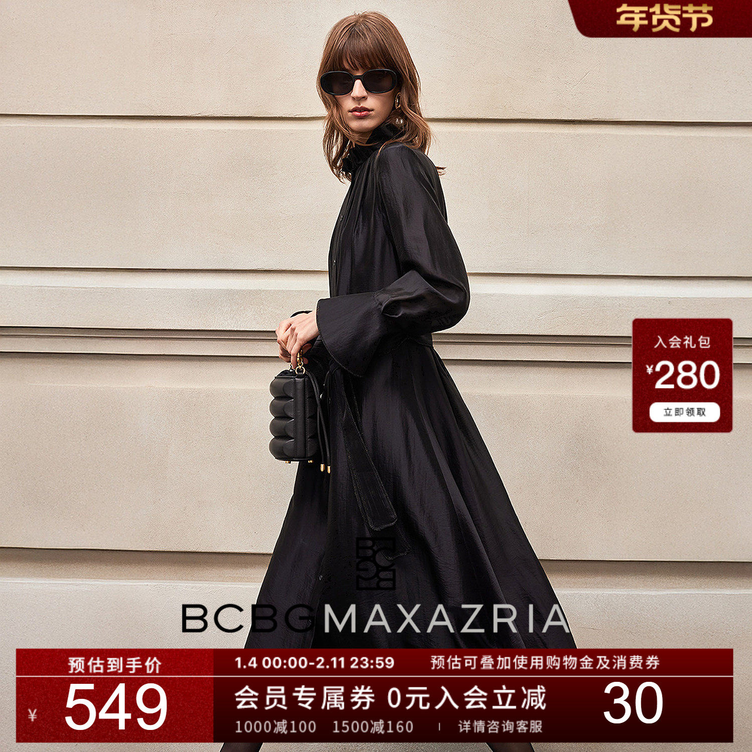 BCBG25秋新款精致时尚花边立领荷叶边长袖系带收腰女长款连衣裙